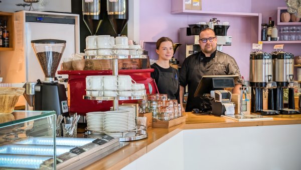 Ravintola Puistolaa pyörittää perheyritys. Tiskin takana Liisi ja Leevi Forsman.