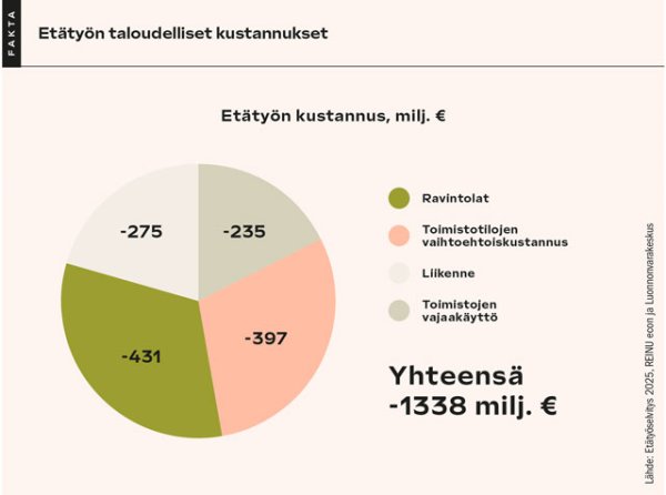 Etätyön taloudelliset vaikutukset ovat pääasiassa muutos- ja sopeutumiskustannuksia. Muutoksesta aiheutuu suoria ja epäsuoria kustannuksia, jotka vaihtelevat toimialojen ja alueiden välillä. Suoria kustannuksia ovat esimerkiksi lounasravintoloiden myynnin lasku tai työmatkaliikenteen supistumisesta aiheutuva palveluntarjoajien tulojen lasku. Kokonaisuudessaan etätyön kasvu nykyiseen tasoon aiheuttaa selvityksessä mukana olleiden toimialojen osalta suoria ja välillisiä kustannuksia yhteensä 1,34 miljardia euroa.